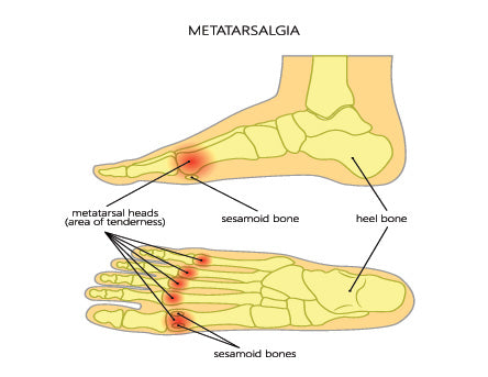 Metatarsalgia can be a painful condition in which sharp, aching, or burning pain is felt in the ball of the foot. Burning or cramping pain associated with weight bearing is typically located in the central metatarsal heads and joints. Generally, inflammation in the ball of the foot is present. There are different forms of metatarsalgia two of which include:
